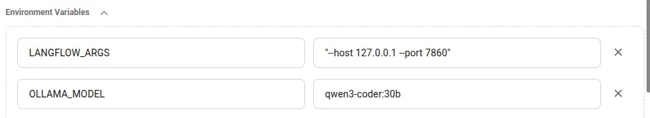 In the template editor you’ll find two really useful configuration variables.OLLAMA_MODELis the most important variable. Here you can choose which model should be downloaded when the instance starts.LANGFLOW_ARGSallows you to pass alternative startup arguments to the langflow application. The defaults should be fine for this demo, but you are free to change these as you need.
